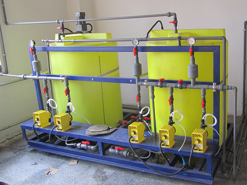 加藥裝置中溶液箱的容積可由超小100L到5000L等,可根據加藥量選定,根據輸送介質的不同,有多種材料可供選擇,如碳鋼(碳鋼襯膠)、不銹鋼、非金屬材質(PE、PVC、PP、PTFE)等。