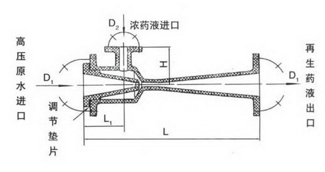高壓原水通過(guò)管道閥門]進(jìn)入噴射器的漸縮段,將靜壓頭轉(zhuǎn)換成動(dòng)能,在噴嘴處成為高速射流,使混合室形成微真空狀態(tài)將高濃度的再生液吸入混合室,并使再生藥液的壓力和速度發(fā)生變化;在混合段內(nèi),水和藥液得到充分地混合,然后注經(jīng)擴(kuò)散段,使再生液減低流速,靜壓頭升高,再通過(guò)出口管道及閥門將稀再生液送到交換器本體中。